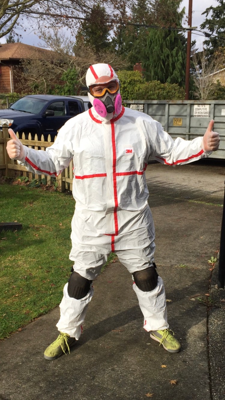 We now had a beautiful new roof and zero budget for anything else. So we had two choices… curl up & cry OR put on a full body suit & a respirator.